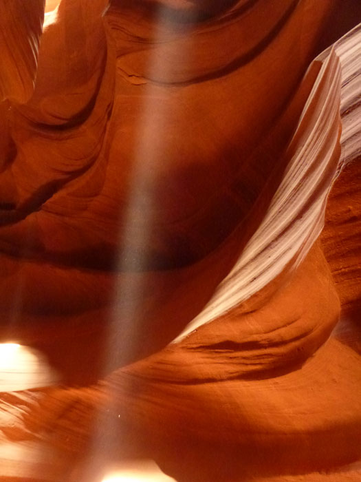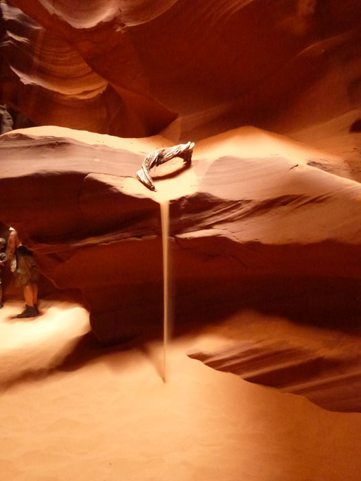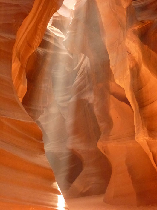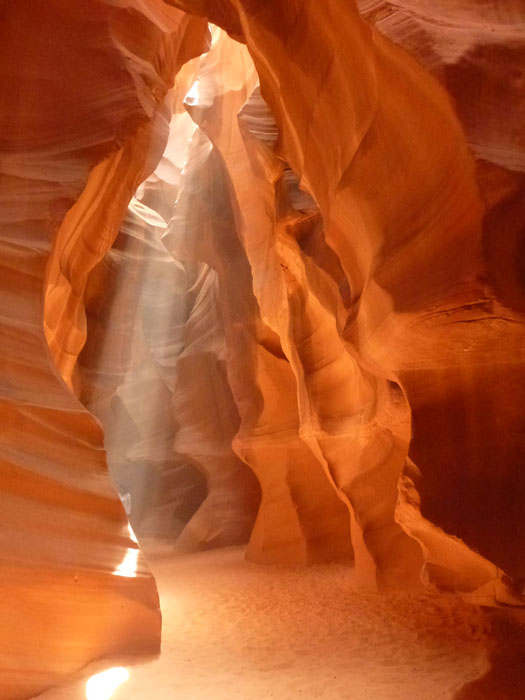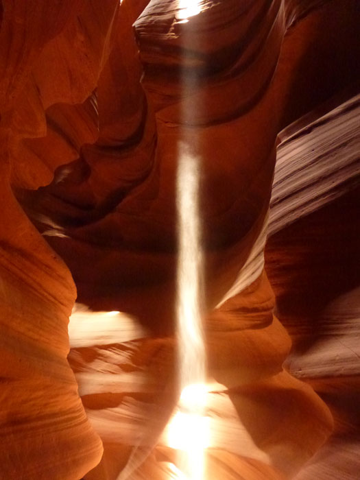 Upper Canyon: Nach dem Besuch vom Lower Canyon, schafften wir, rechzeitig, die Abfahrt der Jeeps zum Eingang des Upper Canyons, mit dem höchsten Sonnenstand um die berühmten Beams zu fotografiern. Der Einstieg im ebenerdigen, sehr engen, höhlenartigen Canyon ist völlig unspektaulär. Nach dem Eingangsbereich ist es zunächst relativ dunkel für Aufnahmen, erst im hintern Bereich öffnen sich einige Spalten in den nun die Sonnenstrahlen auf den Boden des Canyons fallen. Die besagten Beams werden aber nur dann sichtbar wenn die Führer, vom Canyon Rand feinen Sand herabrieseln lassen oder diesen im inneren des Canyon in den Sonnenstrahl streuen. Einige Fotos sind gelungen, aber dazu ist eher ein Stativ nötig. |