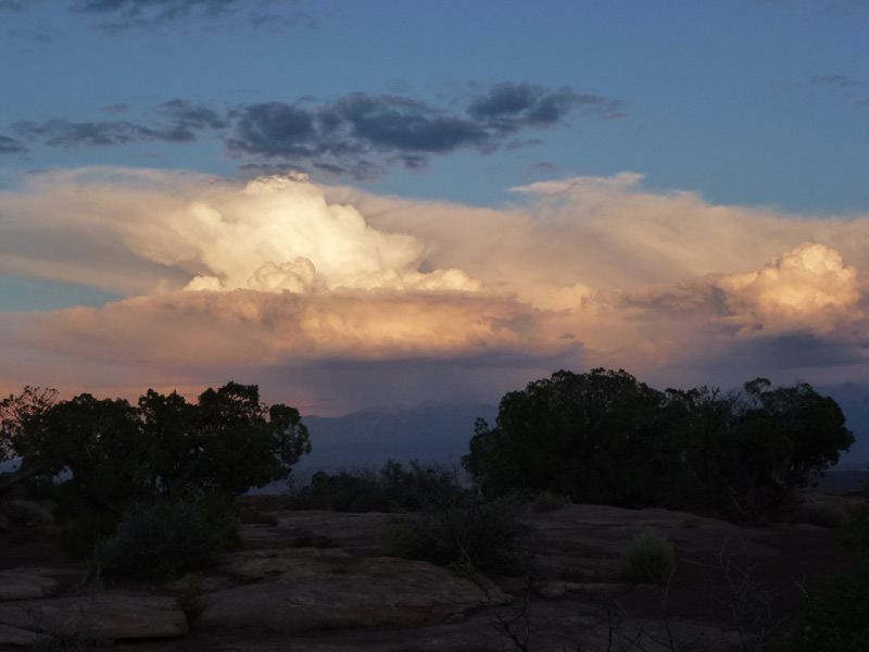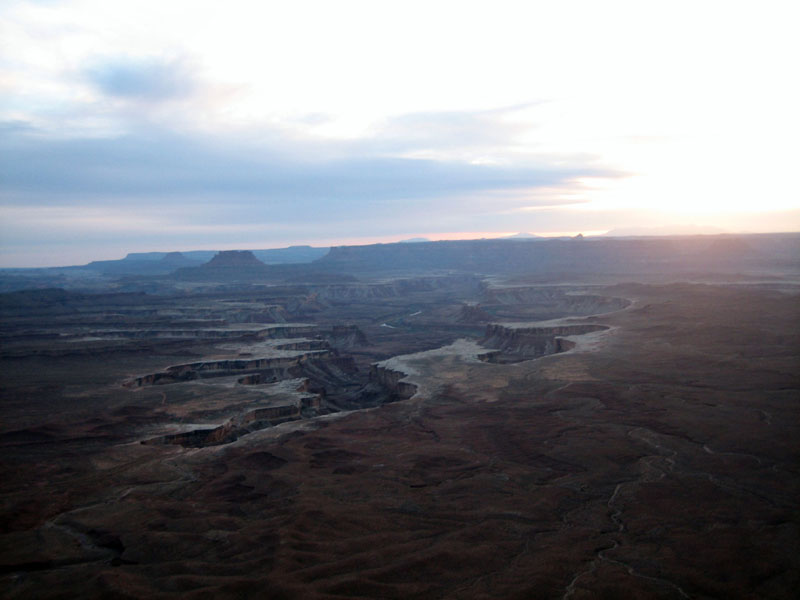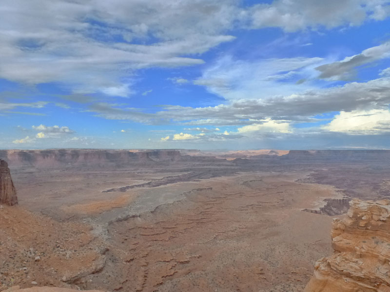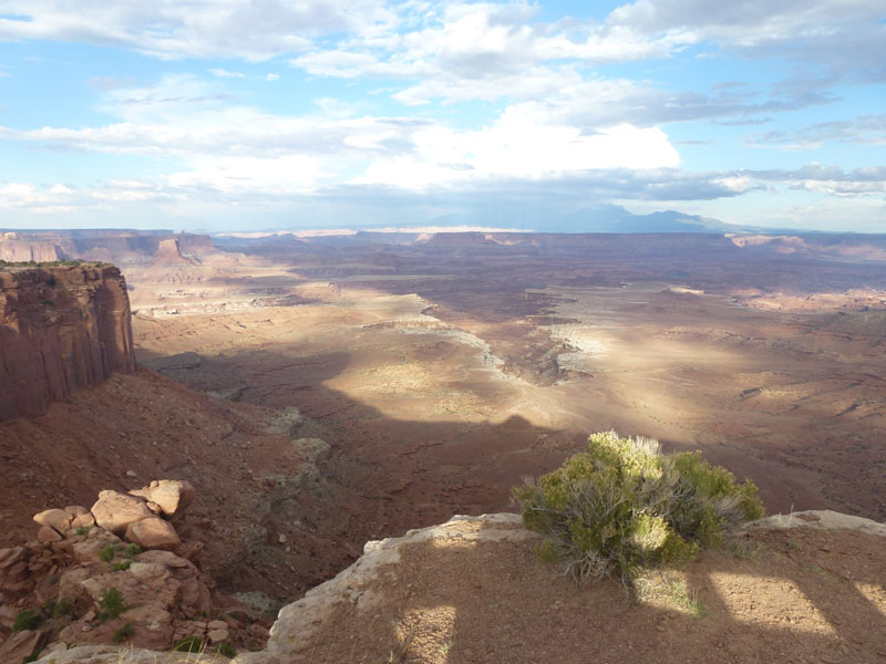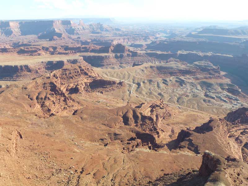 Dead Horse Point Statepark, Auf dem Hochplateau, im Distrikt Island in the Sky, können über die aspaltierte Parkstrasse, mehrere Aussichtspunkte (Grand View Point Overlook) und für Wohnmobile geeignete Campingplätze, angefahren werden. Eine Stichstrasse führt zum Statepark, Dead Horse Point und weiter zum Dead Horse Point Overlook der sich auf einem Hochplateau mit schmalem Zugang über den Colorado River befindet. Mehrere Legenden ranken sich um den Namen Dead Horse Point. Die wahrscheinlichste ist, dass Viehdiebe, Pferde und Rinder auf das Ende des Plateaus trieben, dort war es einfach den schmalen Grad abzusperren. Nur die verkauffähigen Tiere wurden mitgenommen, die restlichen Tiere wurden ihrem Schicksal überlassen und verdursteten auf der wasserlosen Hochebene. |