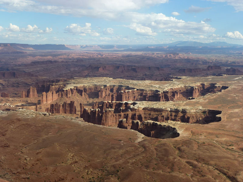 Canyonlands National Park, Ist mit seinen 1,366 km² der größte Nationalpark in Utah. Er besteht aus drei geologischen unterschiedlichen Formationen, die untereinander nicht über Strassen verbunden sind. Island in the Sky als weitläufige Hochebene wird durch die Flüsse, Colorado River und Green River unterbrochen und bieten vom White Rim spektakuläre Aussichten. Im Needles Distrikt, benannt nach von rot und weiß gemaserten Felszacken, die die Gegend prägen, gibt es ebenfalls Steinbögen wie im Arches NP, sind aber nur mit Geländegängige Fahrzeuge erreichbar. The Maze ist der dritte Abschnitt und am wenigsten zugänglich. Bekannt ist der Canyonlands NP auch durch Touren für Mountainbiker oder Geländewagen die mehrere Tage beanspruchen. |