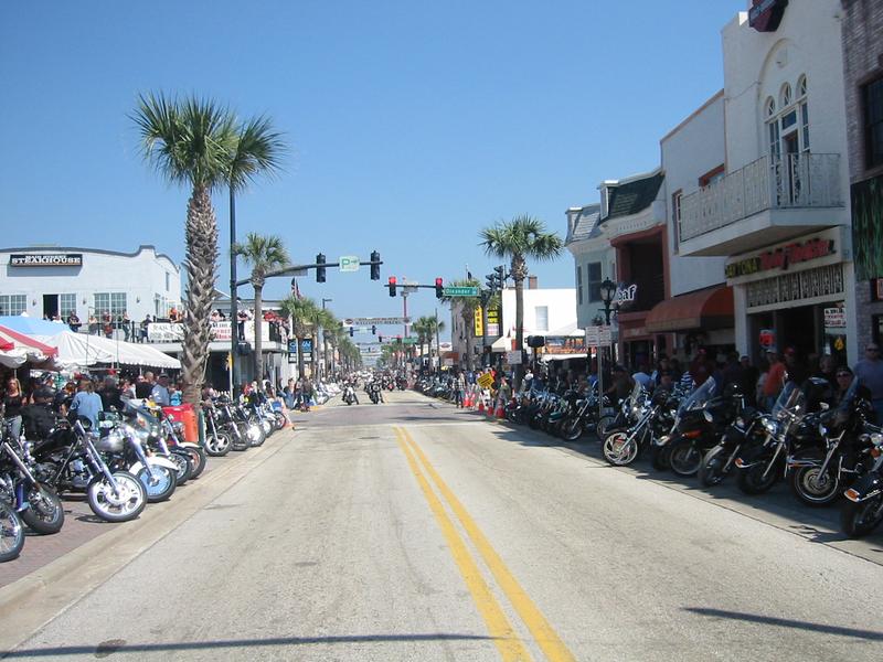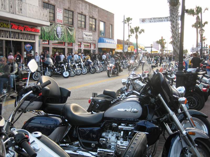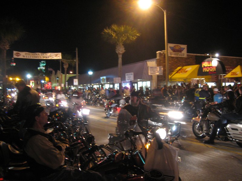 In Daytona, findet um diese Jahreszeit das zweitgrößte Bikertreffen neben Sturgis in South Dakota, der Welt, statt. Eine Woche lebt der Ort im Ausnahmezustand, jede Unterkunft oder freie Fläche, wird an zahlende Kunden vermietet. Vorgärten/Garagen dienen als Fläche für Shops die alles für Biker bereitstellen. Streng ist das promenieren mit dem Motorrad auf der Mainstreet. Wheelie oder sonstige gefährliche Stunts werden sofort geahndet, so geht es trotz der tausende von Biker gesittet zu. |