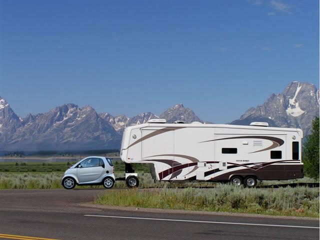| Da es für viele Amerikaner normal ist, im Rentenalter alles zu verkaufen und in einem Wohnmobil oder Anhänger zu leben (Full-Timers) wird die Flexibilität durch ein im Schlepptau befindliches Auto (Towing Car) gewährleistet. Durch einfache aber wirkungsvolle Maßnahmen wird über eine Triangel–Konstruktion (Towing Hitch) das Zweitauto mitgeführt. Leider wird diese sinnvolle Einrichtung ebenfalls durch unsinnige Bestimmungen in Europa verhindert. Im Gegensatz zu Europa, wo Aktiv-Elektrische Bremssysteme unbekannt oder durch TÜV Auflagen unbezahlbar sind, werden in Amerika ausschließlich elektromagnetische Bremssysteme (Elektromagnete in den Bremsnaben ersetzen die Bremshydraulikzylinder) bei Anhängern verwendet. Durch elektronische Bremskontrolle im Zugfahrzeug werden Bremsvorgänge proportional zum Zugfahrzeug eingeleitet. Im Gegensatz zu unseren Auflaufbremssystemen wird damit ein viel feinfühligeres Bremsverhalten mit vorauseilender Bremseinleitung ermöglicht. |