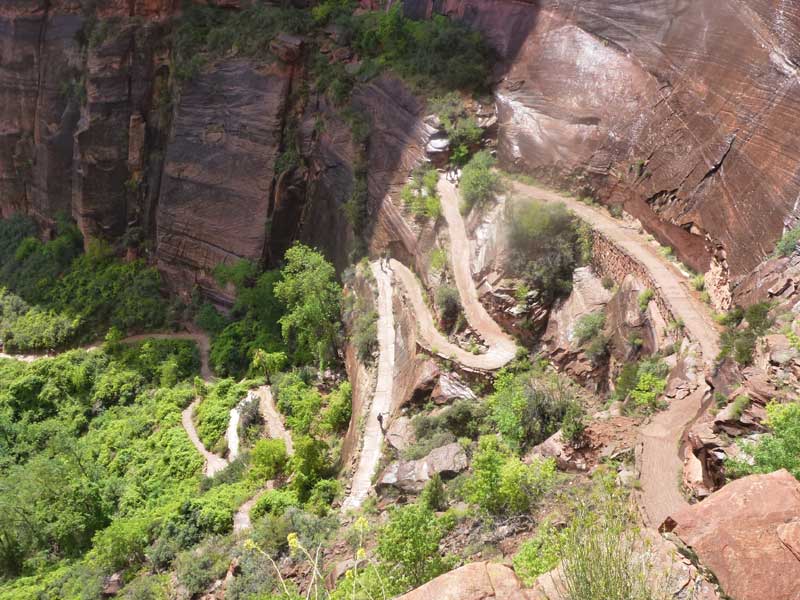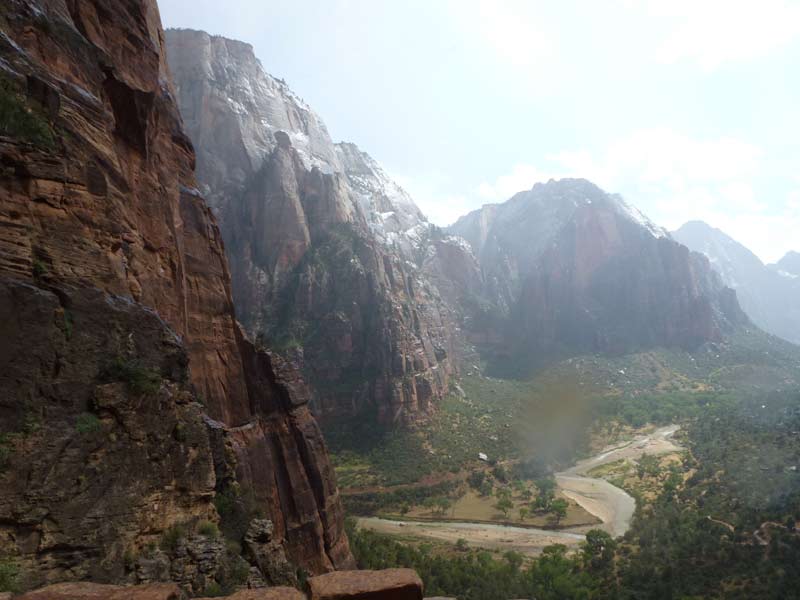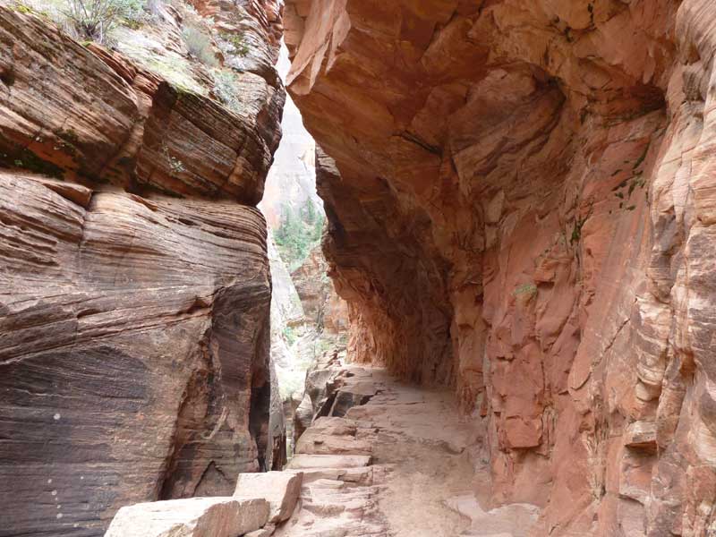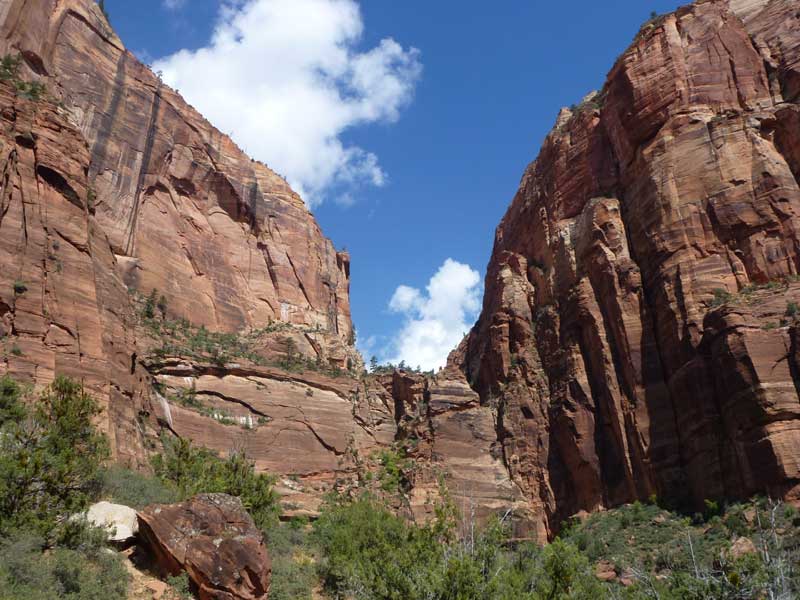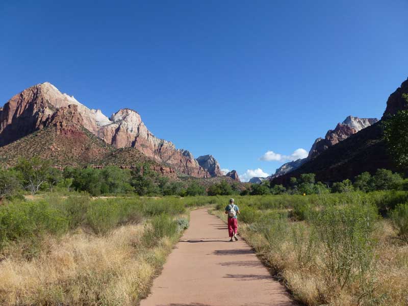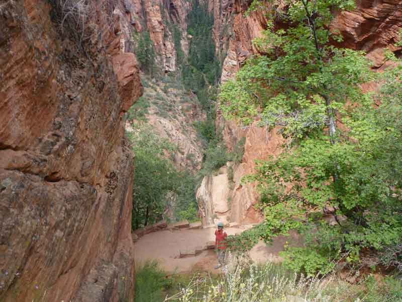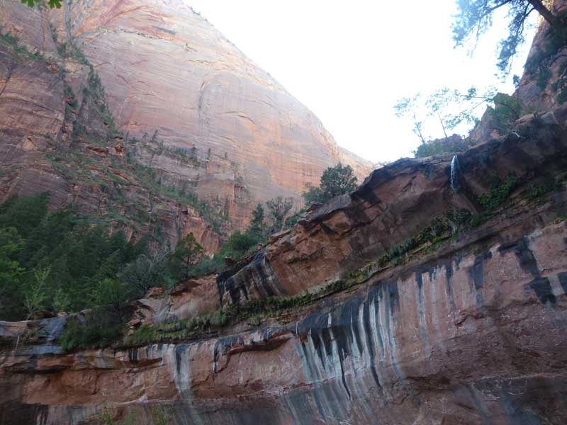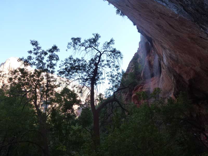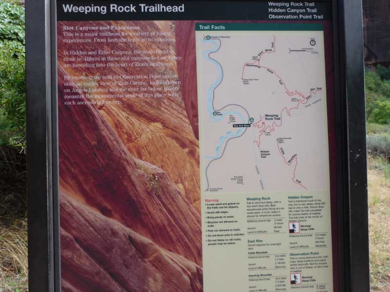 Am Endpunkt des Riverside Walk verengt sich die Schlucht und man kann abhängig vom Wasserstand des Flusses ein gutes Stück in die Schlucht (The Narrows) wandern. Das Wasser ist entsprechend kalt und glitschiger Untergrund durch runde Steine erschwert ein Vorwärtskommen. Wir ersparen uns diese Wanderung da bei den zurückkehrenden Personen auch keine so rechte Freude zu bemerken ist. Spät am Abend kehren wir am Campingplatz zurück und beschließen mit einem gegrillten Steak den Tag. Nach dem Frühstück beschließen wir den Trail über den Weeping Rock und dem Hidden Canyon Trail von ca. 3 Stunden zu machen. Steil in Serpentinen geht es einen asphaltierten Weg die senkrechte Wand hoch, über steile Abhänge erreichen wir den Aussichtspunkt der einen atemberaubenden Blick in den Zion Canyon ermöglicht. Dieser Trail sollte ein Training für den anspruchsvolleren Anstieg von Angel Landing am West Rim werden. |