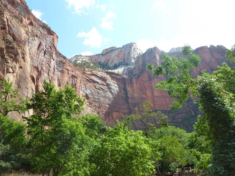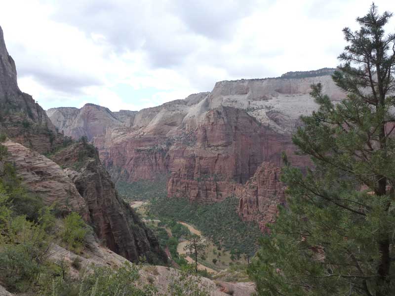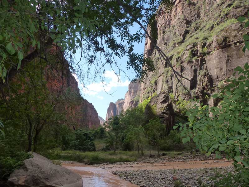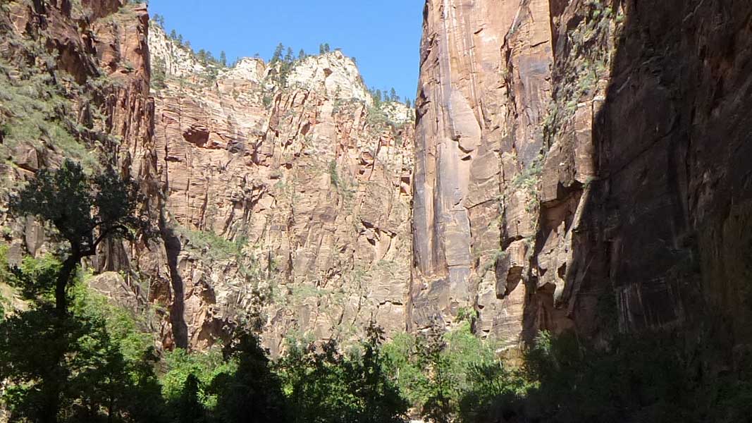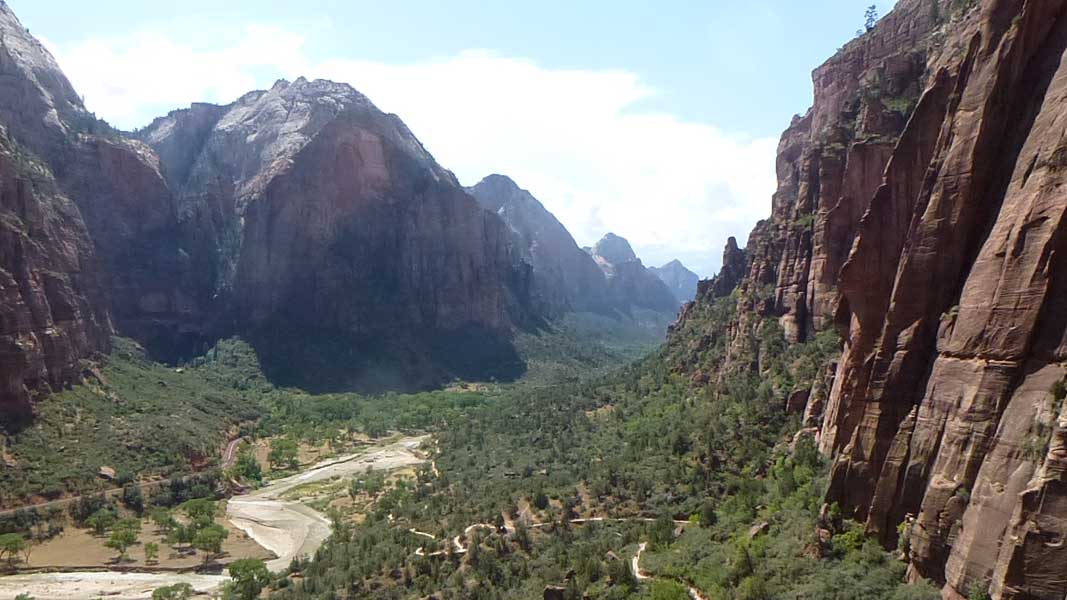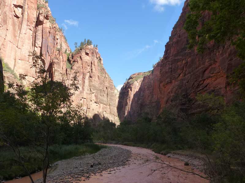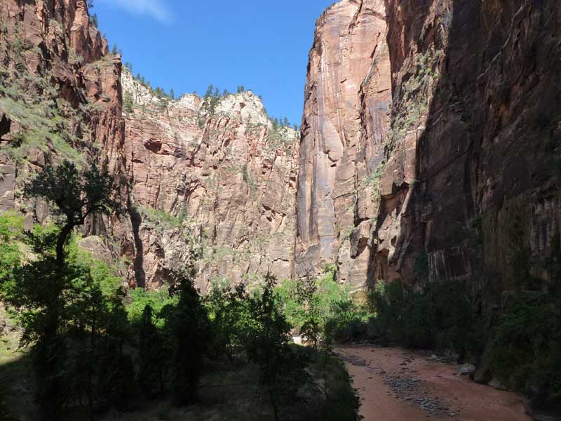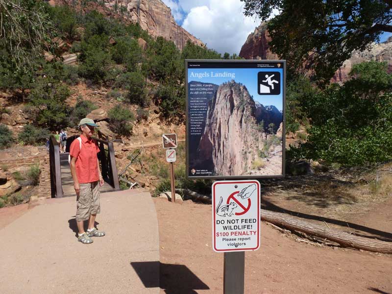 Am Endpunkt des Riverside Walk verengt sich die Schlucht und man kann abhängig vom Wasserstand des Flusses ein gutes Stück in die Schlucht (The Narrows) wandern. Das Wasser ist entsprechend kalt und glitschiger Untergrund durch runde Steine erschwert ein Vorwärtskommen. Wir ersparen uns diese Wanderung da bei den zurückkehrenden Personen auch keine so rechte Freude zu bemerken ist. Spät am Abend kehren wir am Campingplatz zurück und beschließen mit einem gegrillten Steak den Tag. Nach dem Frühstück beschließen wir den Trail über den Weeping Rock und dem Hidden Canyon Trail von ca. 3 Stunden zu machen. Steil in Serpentinen geht es einen asphaltierten Weg die senkrechte Wand hoch, über steile Abhänge erreichen wir den Aussichtspunkt der einen atemberaubenden Blick in den Zion Canyon ermöglicht. Dieser Trail sollte ein Training für den anspruchsvolleren Anstieg von Angel Landing am West Rim werden. |