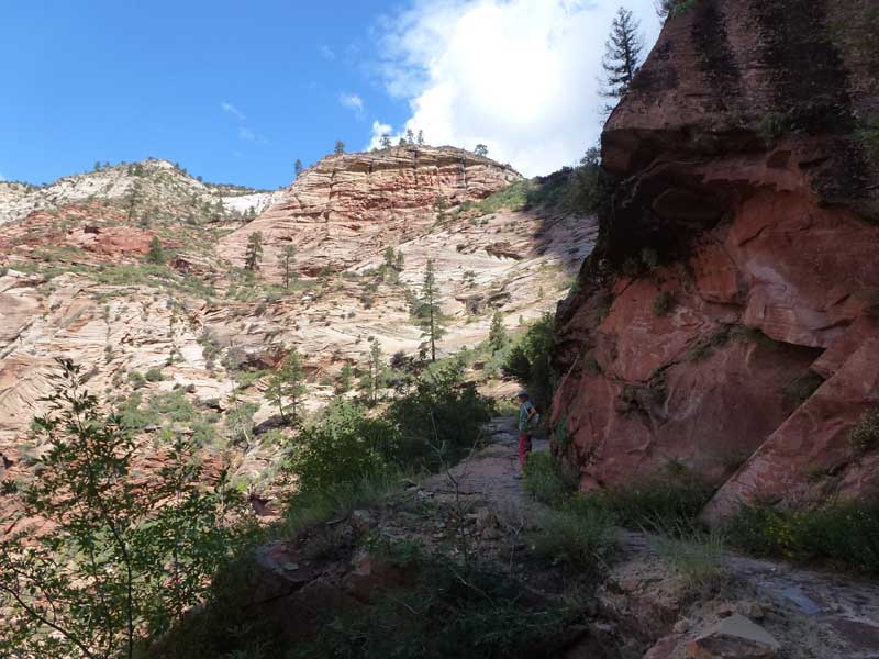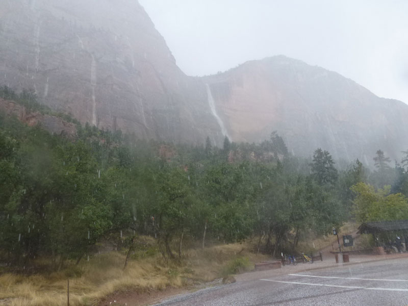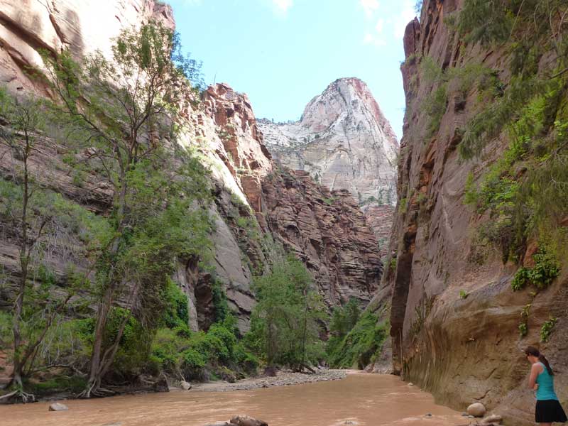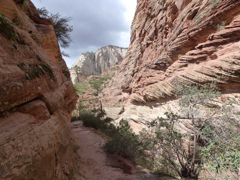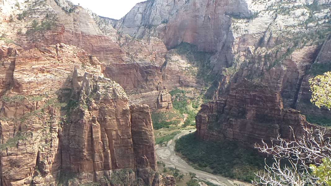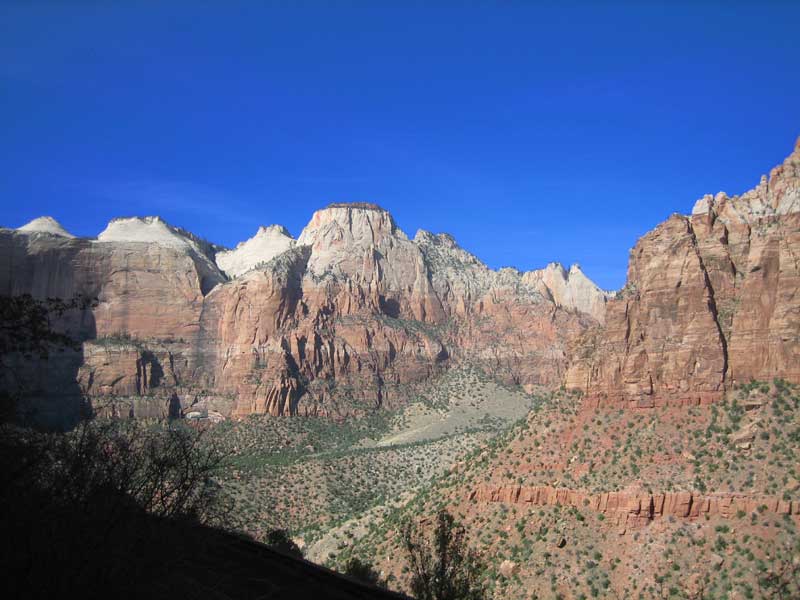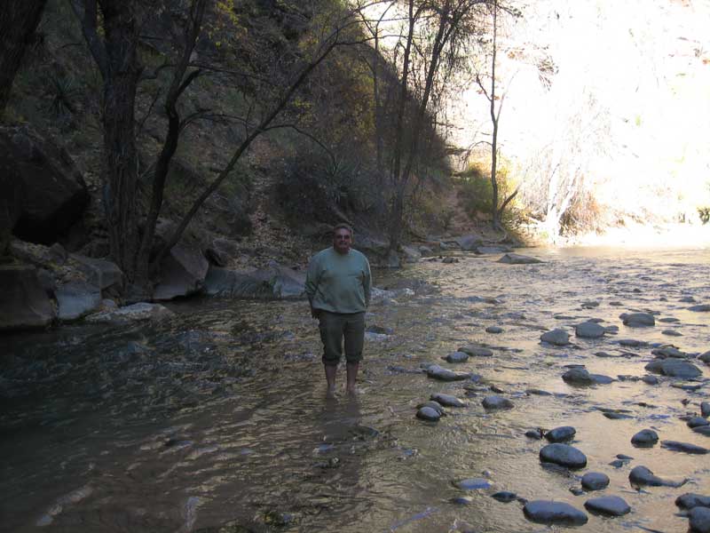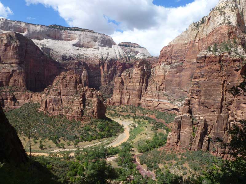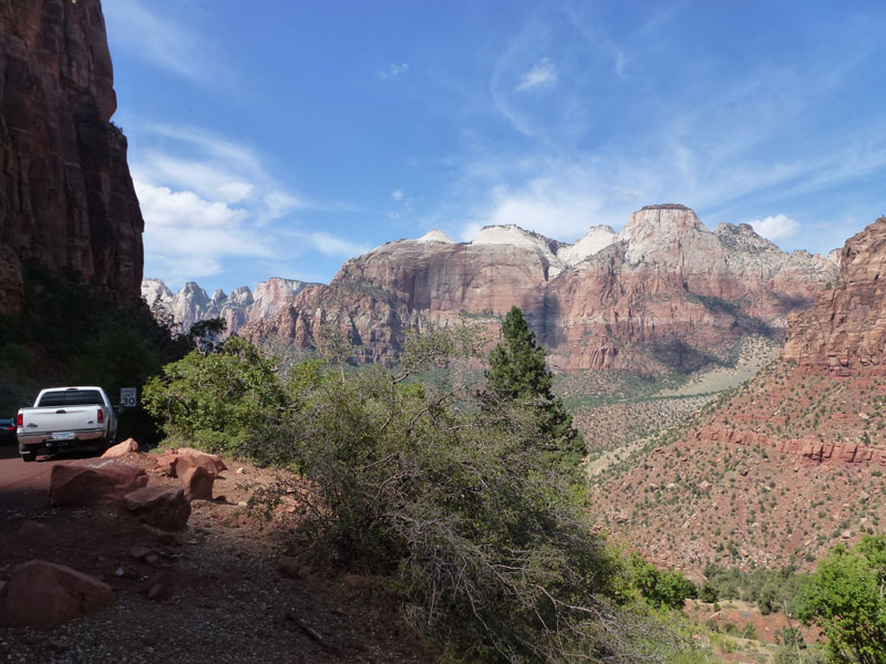 Am Endpunkt des Riverside Walk verengt sich die Schlucht und man kann abhängig vom Wasserstand des Flusses ein gutes Stück in die Schlucht (The Narrows) wandern. Das Wasser ist entsprechend kalt und glitschiger Untergrund durch runde Steine erschwert ein Vorwärtskommen. Wir ersparen uns diese Wanderung da bei den zurückkehrenden Personen auch keine so rechte Freude zu bemerken ist. Spät am Abend kehren wir am Campingplatz zurück und beschließen mit einem gegrillten Steak den Tag. Nach dem Frühstück beschließen wir den Trail über den Weeping Rock und dem Hidden Canyon Trail von ca. 3 Stunden zu machen. Steil in Serpentinen geht es einen asphaltierten Weg die senkrechte Wand hoch, über steile Abhänge erreichen wir den Aussichtspunkt der einen atemberaubenden Blick in den Zion Canyon ermöglicht. Dieser Trail sollte ein Training für den anspruchsvolleren Anstieg von Angel Landing am West Rim werden. |