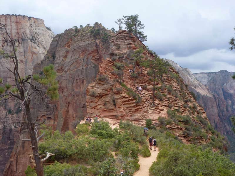 Heute wollen wir es angehen, für Geübte ohne Höhenangst, der Trail Angels Landing. Eigentlich sind wir zu spät am Einstiegspunkt des Trail der über Serpentinen die senkrechte Wand hinaufführt. Denn die Sonne steht auch um diese Jahreszeit noch sehr hoch und der gesamte Weg, bis auf kleinere Stücke befindet sich im direktem Sonnenlicht ohne Schatten. Unsere Schuld, hier muss man sehr früh los um nicht das ganze Stück der Sonne ausgesetzt zu sein. Wir erreichen den Rimpoint um sich für das letzte Stück einen steilen engen Anstieg, die Schlüsselstellung, nämlich über eine 800m lange Gradwanderung, das Plateau auf einen Felsvorsprung zu erreichen. Der Anstieg ist aber mit Seile oder Ketten so wie eingelassene Eisenhaken gesichert aber trotzdem nichts für Personen mit Höhenangst. |
